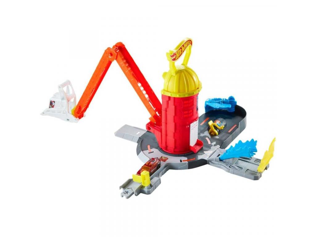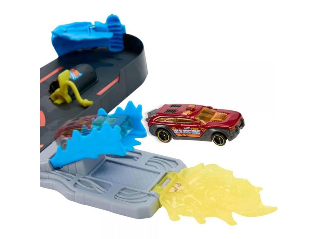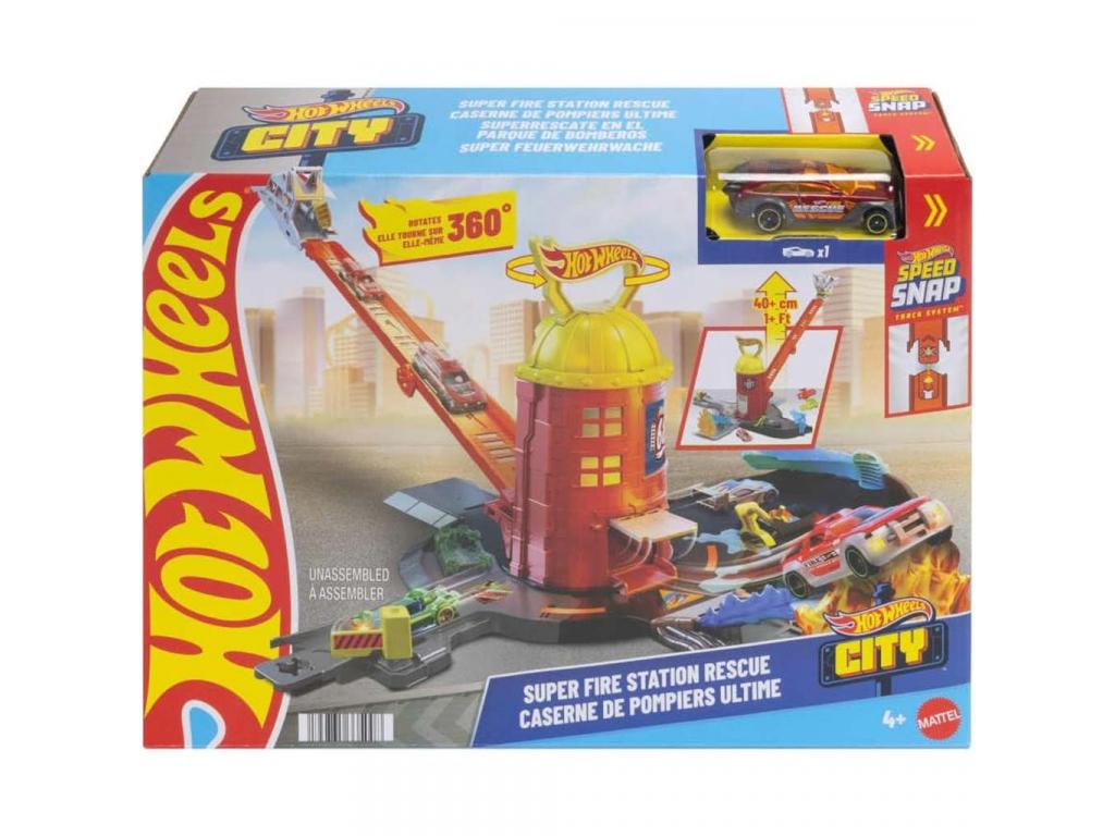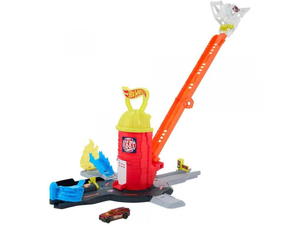 A pálya központi eleme a magas, piros tűzoltótorony, amely forgatható kialakításának köszönhetően akár 360 fokban elfordítható, így több irányból is indíthatók a mentőakciók. A hosszú, narancssárga rámpán a kisautók nagy sebességgel száguldanak lefelé, hogy elérjék a tüzet és megmentsék a veszélyben lévő várost. A készlethez tartozó Hot Wheels tűzoltó kisautó már önmagában is akcióra kész, de a pálya kompatibilis más Hot Wheels kisautókkal is, így a játékélmény tovább bővíthető.