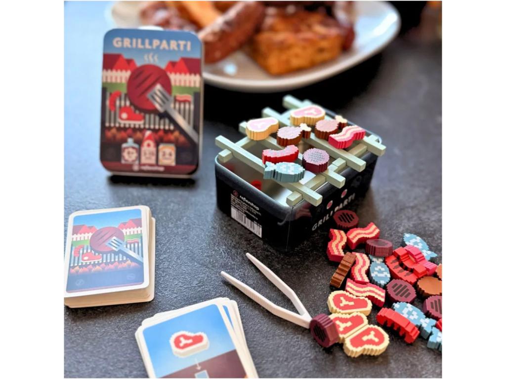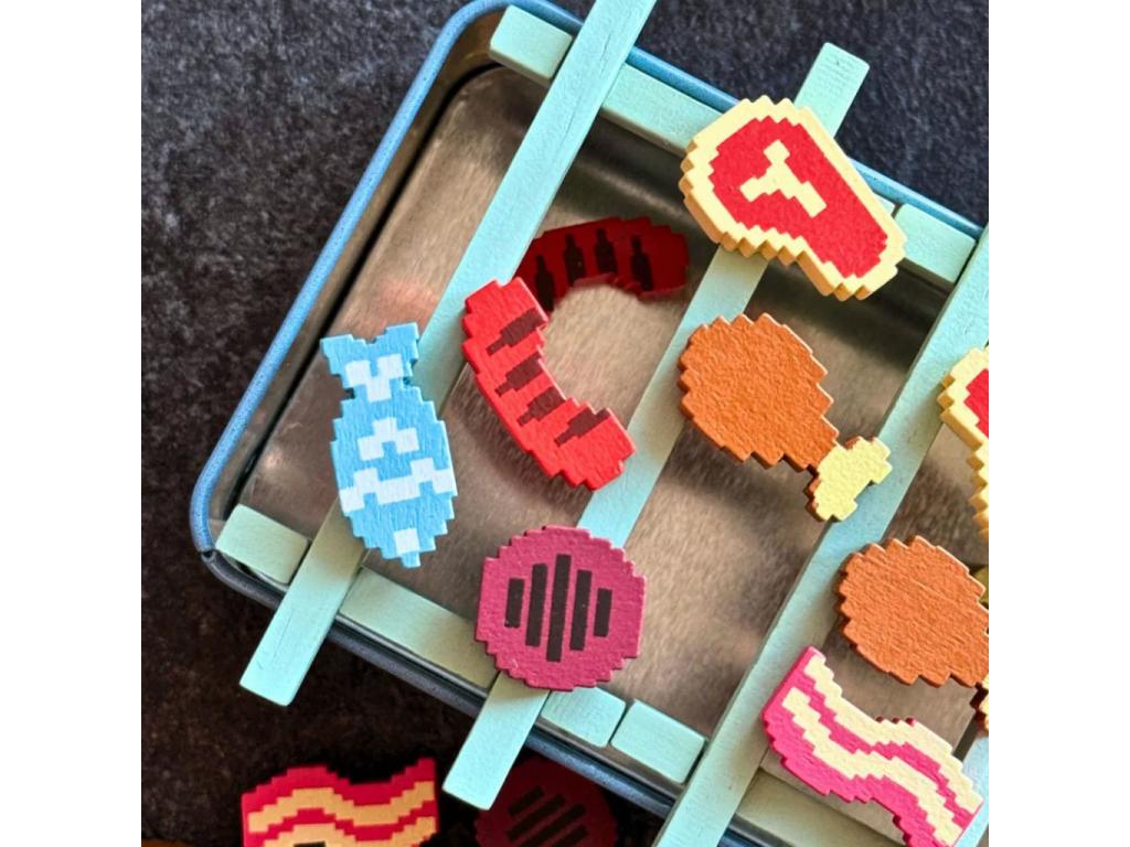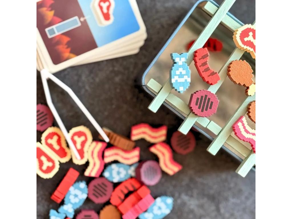 A doboz rengeteg aprólékosan kidolgozott fa ételdarabot tartalmaz: steakek, szalonna, hal, kolbász és csirkecomb mind-mind retro, pixel-art stílusban. A játékmechanika rendkívül gyors, egy-egy parti akár 3-15 perc alatt is lejátszható, így ideális választás rövid játékestekhez vagy akár utazáshoz is. Kompakt fémdoboza strapabíró és könnyen szállítható, így mindig kéznél lehet, ha hirtelen kedvetek támad egy kis grill mókához.