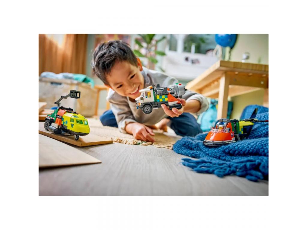A LEGO City: Repülőgép, emelőkosaras kocsi és légpárnás jármű remix (60505) leírása:
