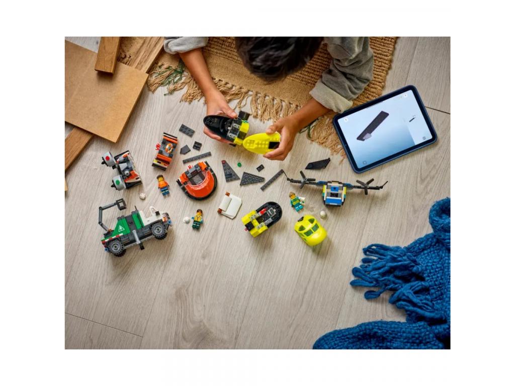 3 MENTŐJÁRMŰJÁTÉK 1 KÉSZLETBEN A LEGO City Repülőgép, emelőkosaras kocsi és légpárnás jármű remix (60505) készlet egy fantáziadús szett 3 kombinálható mentőjárművel, 7 éves kortól.