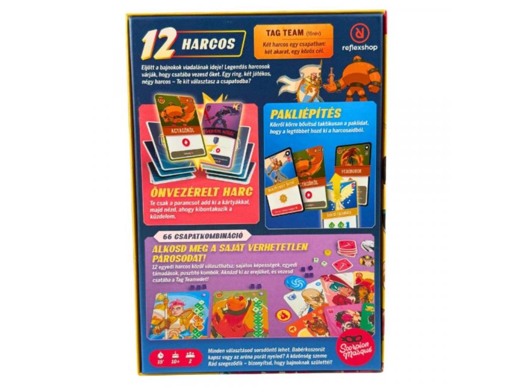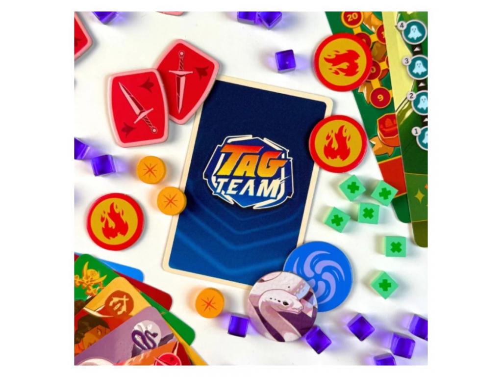 Tag Team társasjáték pörgős, kétfős pakliépítős arénaharc, ahol két harcosból álló csapatokat raktok össze, és előre megtervezett taktikával vezettek végig egy látványos, önvezérelt küzdelmet. A játék hangulata olyan, mint egy képregényes bajnokság: 12 különböző stílusú és képességű harcos várja, hogy párosítsátok őket, majd a saját paklitokból kijátszott kártyák döntik el, milyen támadások, védekezések és pusztító kombók követik egymást az arénában.