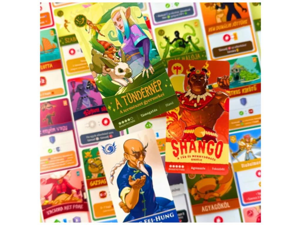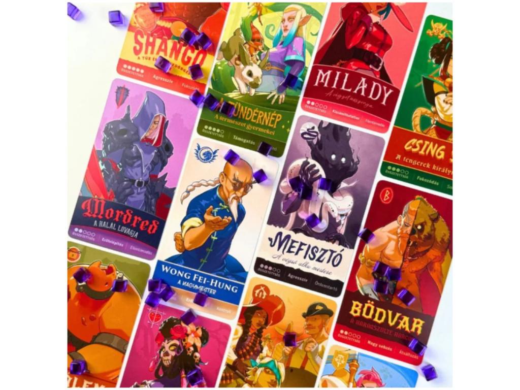 Gazdag tartalom: karaktertáblák, kártyák, lapkák és jelölők a változatos meccsekhez