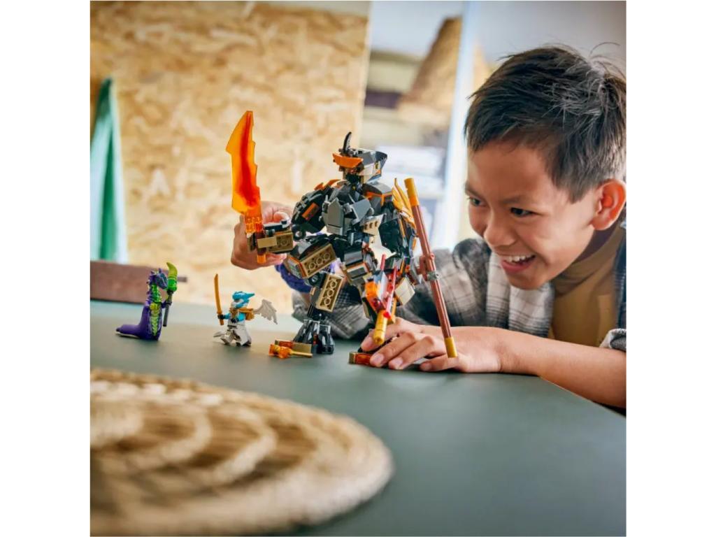 3 NINJAGO MINIFIGURA Ez a LEGO robotos készlet tartalmazza Cole-t kalapáccsal, a sárkányformát öltő Zane-t karddal és a maró szörnyet a botjával, hogy a rajongók a jó és a gonosz közötti csatákat játszhassanak el