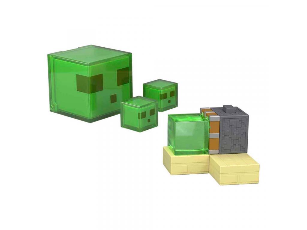 A szett központi eleme a ragadós dugattyú (Sticky Piston), amely a Minecraftban jól ismert módon képes blokkokat elmozdítani és megragadni. A készletben található slime kockák különböző méretben jelennek meg, az ikonikus zöld, áttetsző megjelenéssel és a jellegzetes pixeles arccal. Ezek a slime figurák tökéletesen visszaadják a játék hangulatát, és kiválóan használhatók különféle csapdás vagy akciódús jelenetek eljátszásához.
