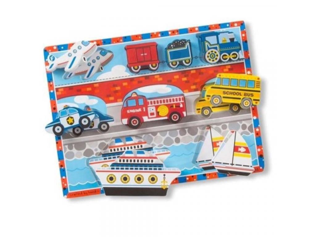 A Melissa & Doug: Járműves kirakó remek választás, ha a gyermeked rajong az autókért, vonatokért és mindenféle közlekedési eszközért. Ez a színes, vidám fa kirakó izgalmas utazásra hív: a képen repülő, vonat, rendőrautó, tűzoltóautó, iskolabusz, hajó és vitorlás is helyet kapott, így a kicsi játék közben ismerkedhet meg a különböző járműtípusokkal és azok szerepével.