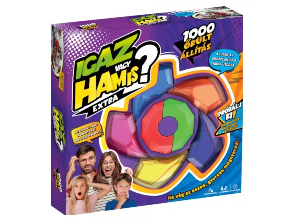 Igaz vagy hamis Extra interaktív társasjáték pörgős, televíziós kvízműsor-hangulatú családi játék, ahol a tudás mellett a villámgyors reakció is számít. A beépített, magyarul beszélő elektronikus játékmester sorra mondja a meghökkentő állításokat, a játékosoknak pedig csak egy dolguk van: minél gyorsabban eldönteni, hogy igaz vagy hamis. Több mint 1000 kérdés gondoskodik arról, hogy minden parti más legyen, ráadásul a játék magyar vonatkozású érdekességeket is tartalmaz, így a nevetés mellett új infókkal is gazdagodtok.