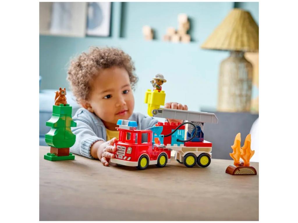 SZÓRAKOZTATÓ FUNKCIÓK Tartalmaz egy tűzoltóautó-modellt levehető pótkocsival, egy tűzoltó figurát, LEGO DUPLO mókust, baltát és csavarkulcsot, hogy ösztönözze a fantáziadús, hősies játékot