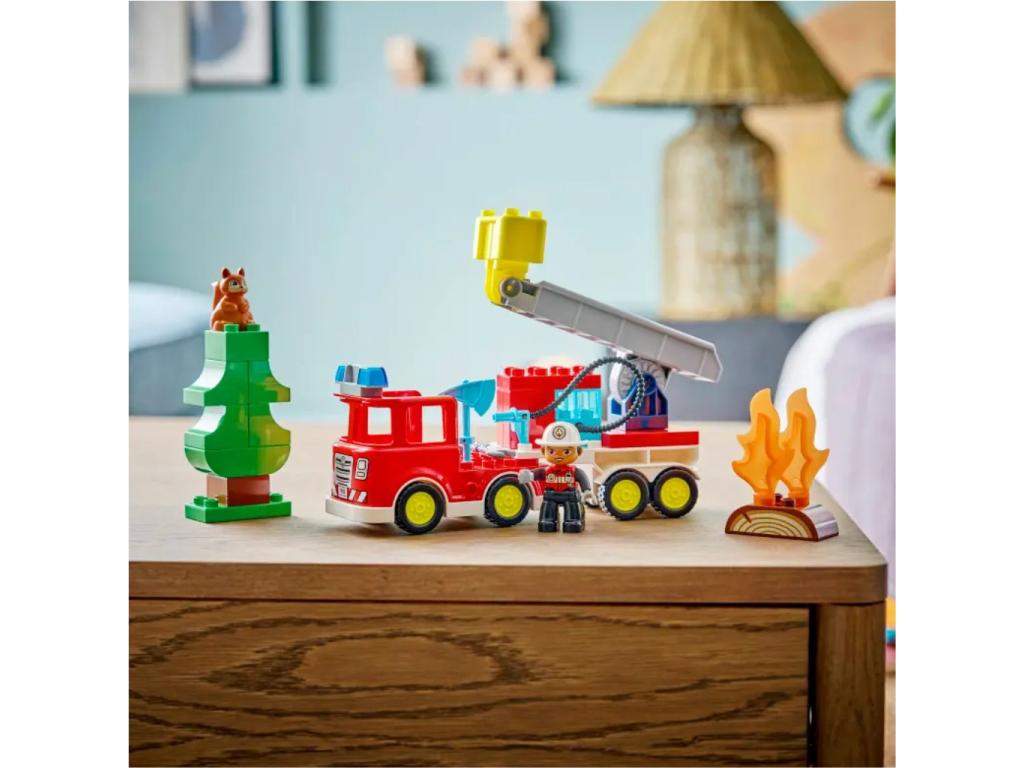 LEGO DUPLO tűzoltó játék Ez a fantáziadús játék lehetővé teszi a kisgyerekek számára, hogy elképzeljék, hogy mindennapi hősök, akik létrán másznak fel, hogy a tömlővel eloltsák az égő rönköt, miközben egy mókus távolról figyeli az eseményeket