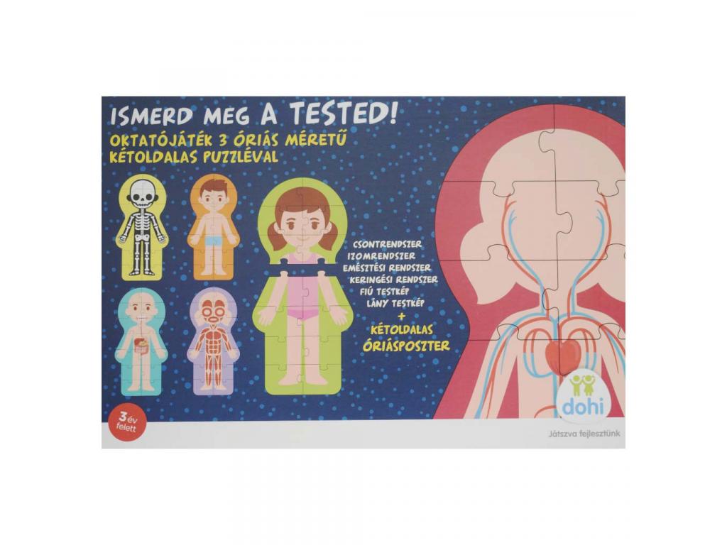 A készlet egy 3 óriás méretű, kétoldalas puzzle-ből áll, amelyek különböző nézőpontból mutatják be az emberi testet. A gyermek megismerheti a csontvázat, az izmokat, a keringési rendszert, az emésztőrendszert, valamint a fiú- és lánytest közötti alapvető különbségeket is. A másik oldalon egy kétoldalas óriás poszter segíti a további tanulást és ismétlést, amely akár a gyerekszoba falára is kitehető, így folyamatosan szem előtt marad.