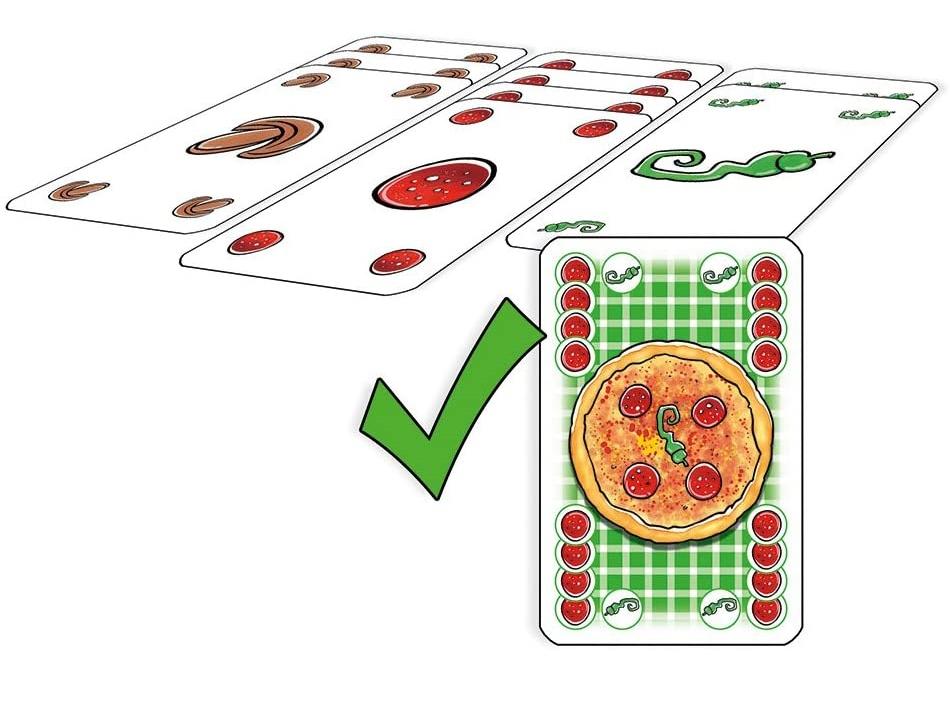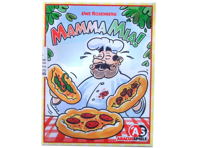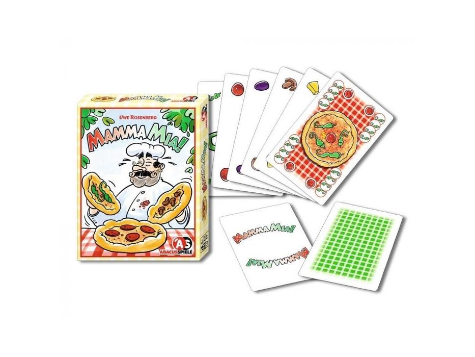 A Mamma Mia kártyajáték leírása: Ebben az ízletes kártyajátékban a játékosok pizzakészítok borébe bújnak: felveszik a pincérektol a rendeléseket, a raktárból eloveszik az összetevoket, majd mindent a sütobe berakva megsütik a pizzát. Amikor a raktárból kifogynak az összetevok, a játékosok kinyitják a sütot: ekkor kiderül, mely pizzák készültek el rendesen, és melyek nem. A hiányosan elkészült pizzák rendeléseit a játékosok visszaveszik, és azokkal a következo játékfordulóban újra próbát tehetnek. A játék három fordulóból áll, a harmadik forduló végén az a játékos lesz a gyoztes, akinek a legtöbb pizzája készült el.