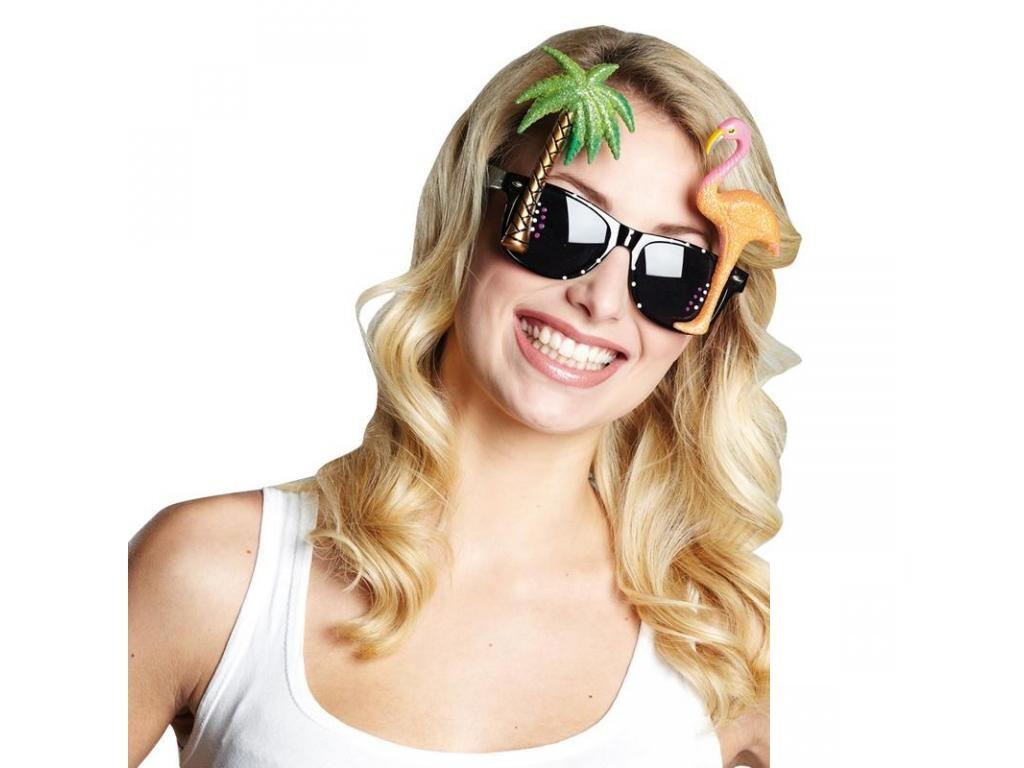 A Napszamüveg pálmafával leírása: Fekete színezett napszemüveg strasszokkal, pálmafával és flamingóval.