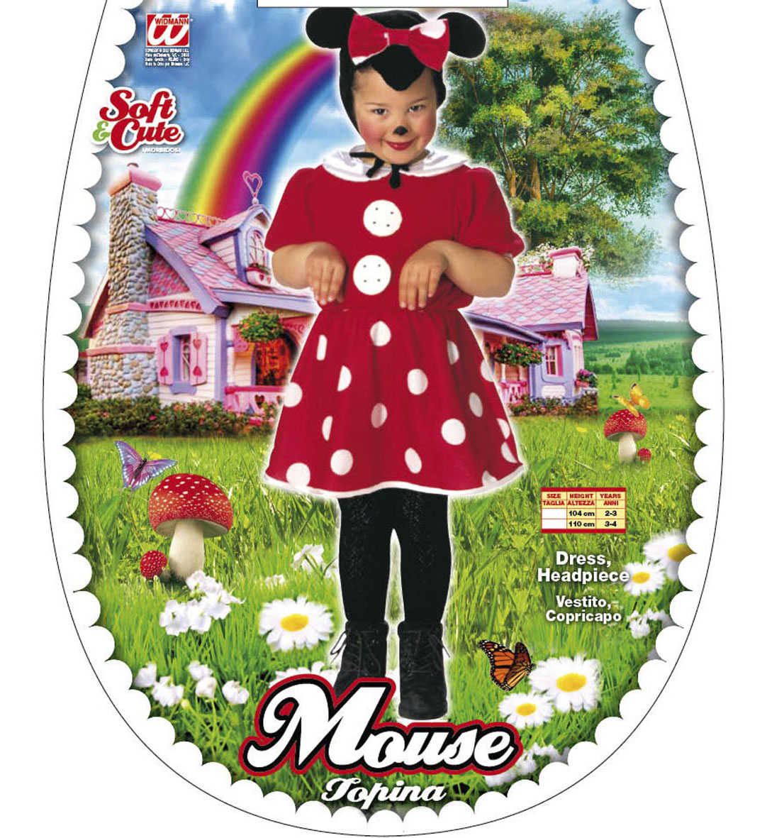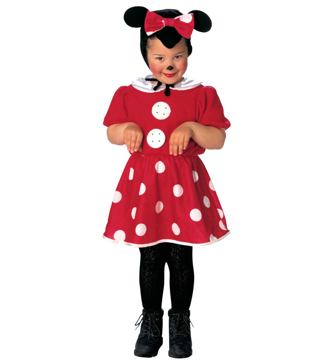Aranyos, piros színű kisegér jelmez. A jelmez egy ruhából, és egy egérfejet mintázó sapkából áll.