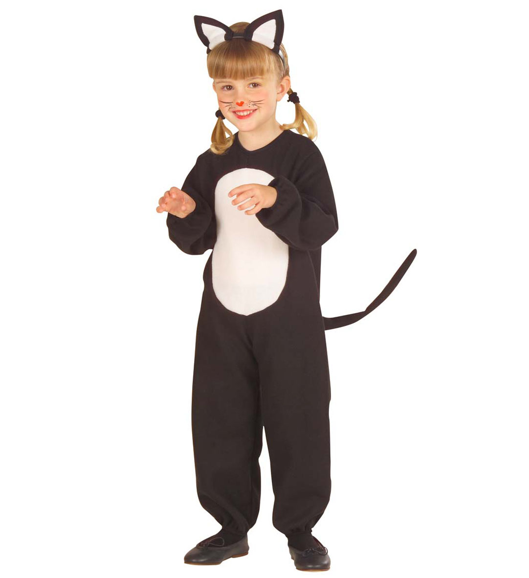 Fekete bebújós cicajelmez, füles fejdísszel, lányok számára.