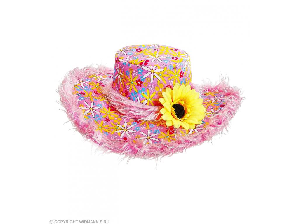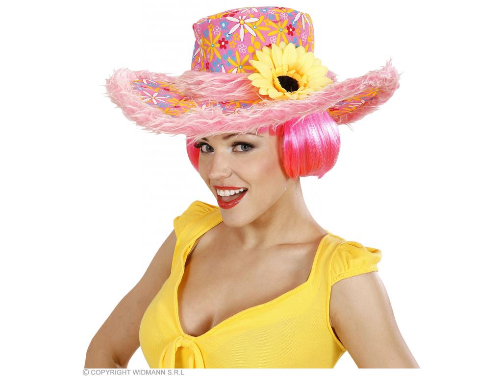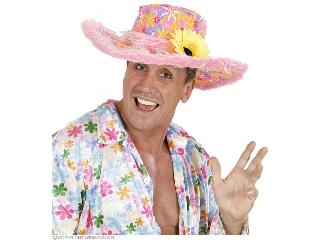 Igazi nyári, tengerparti, ibizai hangulatot árasztó, vidám, virágmintás kalap, rózsaszín, plüss szegéllyel, illetve napraforgóval díszítve. Jelmez részeként, illetve önállóan is hordható.