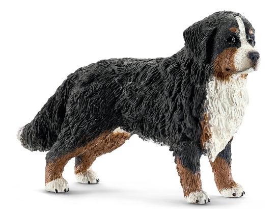 Gumi és műanyag ötvözetéből készült, kézzel festett Schleich figura. A Berni pásztorkutyák barátságos, nagy fekete-barna kutyák fehér folttal a mellkasukon.